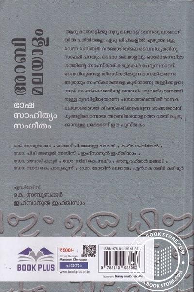 കെ. അബൂബക്കർ . കക്കാട്. പി. അബ്ദുല്ല മൗലവി, ഒഫീറ ഗംലിയേൽ . ഡോ. പി.ടി അബ്ദുൽ അസീസ് . ഇഹ്സാനുൽ ഇഹ്തിസാം . ഡോ. മനോജ് കുറൂർ. ഡോ. സിമി കെ. സലിം അബ്ദുറഹ്മാൻ മങ്ങാട് . ഡോ. ബാവ കെ. പാലുകുന്ന് , ഡോ. മോയിൻ മലയമ്മ - എൻ.കെ ശമീർ കരിപ്പൂർWrite a review on this book!. Write Your Review about അറബി മലയാളം ഭാഷ സാഹിത്യം സംഗീതം Other InformationThis book has been viewed by users 12 times