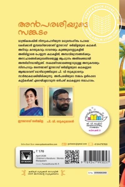മാന്ത്രികശംഖിൽ നിന്നുംപൊഴിയുന്ന മധുരസംഗീതം പോലെ കേൾക്കാൻ ഇമ്പമേറിയവയാണ് ഈറോഡ് ശർമ്മിളയുടെ കഥകൾ. അറിവും കൗതുകവും ഭാവനയും കുഞ്ഞുമനസ്സുകളിൽ അതിരില്ലാതെ പെയ്യുന്ന കഥകളിൽ, അന്ധവിശ്വാസങ്ങൾക്കും അനാചാരങ്ങൾക്കുമെതിരെയുള്ള ആഹ്വാനം അതിശക്തമായി അന്തർലീനമായിട്ടുണ്ട്. സകലജീവജാലങ്ങളോടുമുള്ള അനുകമ്പയും സ്നേഹവും തന്നെയാണ് ഈറോഡ് ശർമ്മിളയുടെ കഥകളുടെ ആത്മാവെന്ന് മൊഴിമാറ്റത്തിലൂടെ പി. വി സുകുമാരനും സാർത്ഥകമാക്കിയിരിക്കുന്നു. അൻപരശിയുടെ സങ്കടം ഉൾപ്പെടെ കുട്ടികൾക്ക് ഏറെയിഷ്ടമാവുന്ന ഒൻപത് കഥകളുടെ സമാഹാരം.Write a review on this book!. Write Your Review about അൻപരശിയുടെ സങ്കടം Other InformationThis book has been viewed by users 14 times