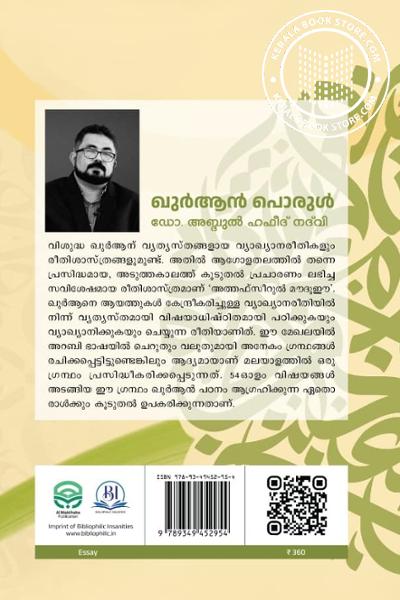 ഖുർആനെ ആയത്തുകൾ കേന്ദ്രീകരിച്ചുള്ള വ്യാഖ്യാനരീതിയിൽ നിന്ന് വ്യത്യസ്തമായി വിഷയാധിഷ്ഠിതമായി പഠിക്കുകയും വ്യാഖ്യാനിക്കുകയും ചെയ്യുന്ന രീതിയാണിത്. ഈ മേഖലയിൽ അറബി ഭാഷയിൽ ചെറുതും വലുതുമായി അനേകം ഗ്രന്ഥങ്ങൾ രചിക്കപ്പെട്ടിട്ടുണ്ടെങ്കിലും ആദ്യമായാണ് മലയാളത്തിൽ ഒരു ഗ്രന്ഥം പ്രസിദ്ധീകരിക്കപ്പെടുന്നത്. 54 ഓളം വിഷയങ്ങൾ അടങ്ങിയ ഈ ഗ്രന്ഥം ഖുർആൻ പഠനം ആഗ്രഹിക്കുന്ന ഏതൊ രാൾക്കും കൂടുതൽ ഉപകരിക്കുന്നതാണ്.Write a review on this book!. Write Your Review about ഖുർആൻ പൊരുൾ Other InformationThis book has been viewed by users 15 times