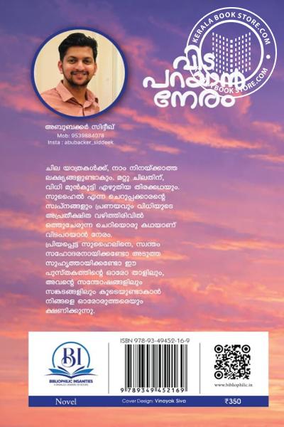 പ്രിയപ്പെട്ട സുഹൈലിനെ സ്വന്തം സഹോദരനായിക്കണ്ടോ അടുത്ത സുഹൃത്തായിക്കണ്ടോ ഈ പുസ്തകത്തിൻ്റെ ഓരോ താളിലും, അവന്റെ സന്തോഷങ്ങളിലും സങ്കടങ്ങളിലും കൂടെയുണ്ടാകാൻ നിങ്ങളെ ഓരോരുത്തരെയും ക്ഷണിക്കുന്നു.Write a review on this book!. Write Your Review about വിട പറയാന് നേരം Other InformationThis book has been viewed by users 19 times